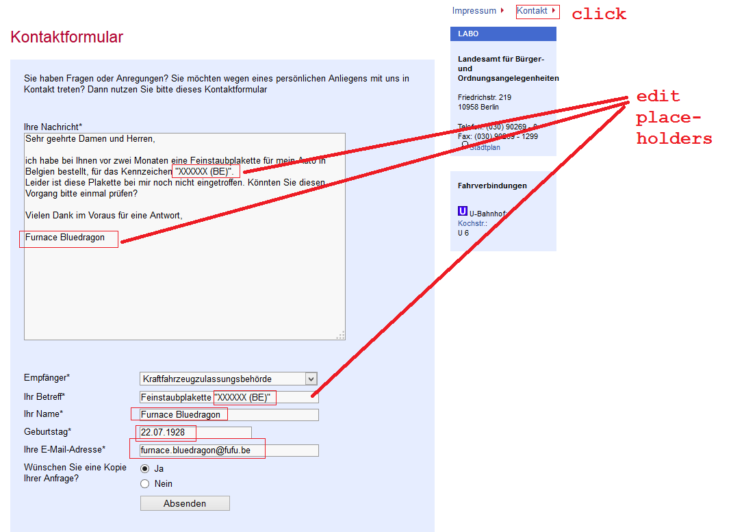 Lightfox a écrit: furnace a écrit: Ah c est étonnant, tu as essayer de les contacter par mail en Mettant une preuve d achat en pièce jointe ? Pour ça, faudrait déjà qu'il y ait une email de contact: j'ai cherché comme je pouvais sur le site (qui est surtout en allemand), et j'ai rien trouvé... voici comment tu peut proceder : A partir de cette page : https://www.berlin.de/labo/kfz/dienstle ... hop.en.phpsuis simplement les instructions de l'image que je poste juste en dessous. je t’envoie un texte en MP pour que tu pourras copier et coller pour t'expliquer. Merci a HAI pour son aide