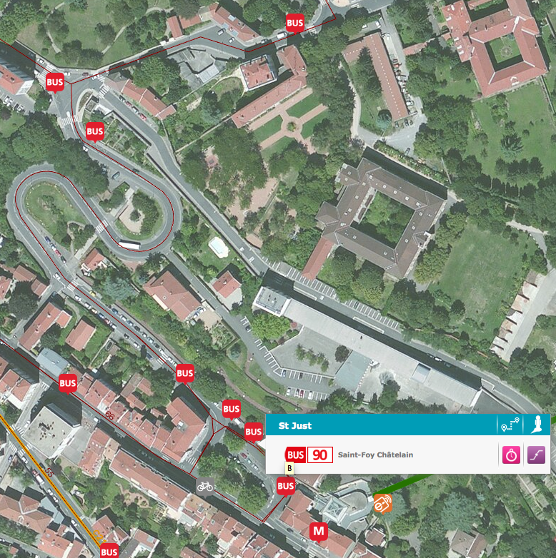 Le metro D arrêt Vieux Lyon est en bas de l'écran. On peut s'arrêter à l'un des 2 arrêts de Bus en haut du zig zag.