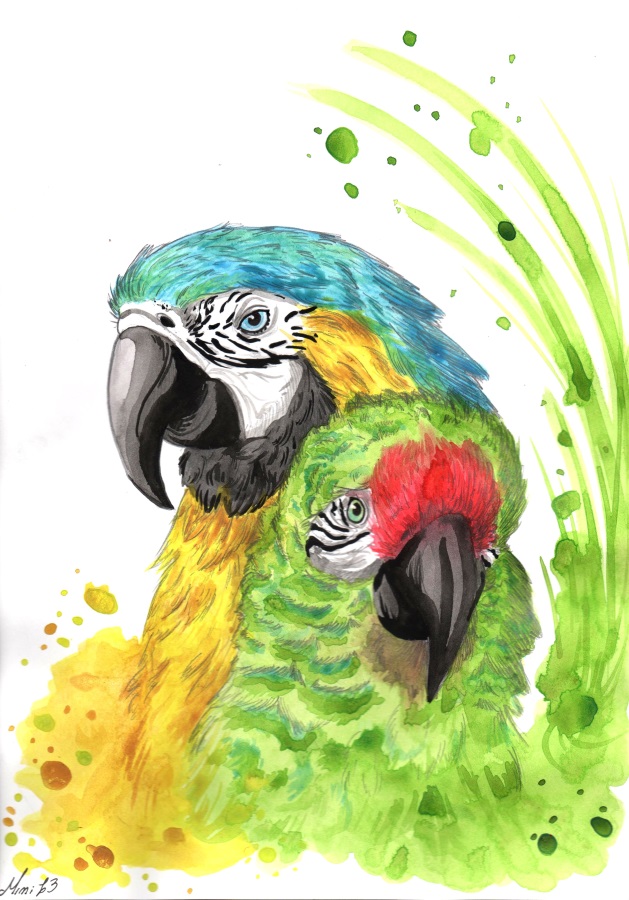 Je suis une grande fan d'oiseaux exotiques. Celui derrière est un ara ararauna et l'autre un amazone à front rouge *connaisseuse*. 'Sont bien plus beaux que l'affreux cacatoès à huppe jaune, moche et déplumé que j'ai chez moi