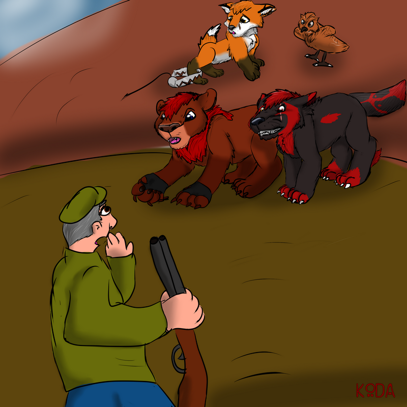 Voici un nouveau dessin un cadeau pour Kouta vu qu'on protège les animaux tous les deux. C'était plus simple car on est en feral mais j'ai fait n'importe quoi pour le chasseur et la chouette pas l'habitude de les dessiner ...