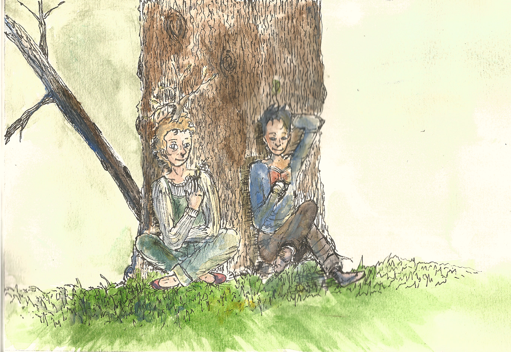 Sinon, j'aime beaucoup la petite touche de bleu que tu as apporté dans le fond, mais c'est tellement timide, exploite davantage cette idée! Je pense que tu aurais gagné en lisibilité si tu avais peins l'arbre entièrement en bleu par contraste avec les teintes beiges de tes personnages. Hésite pas à faire des petits essais sur des minis dessins pour voir comment ça peut rendre avant d'attaquer ton illus.