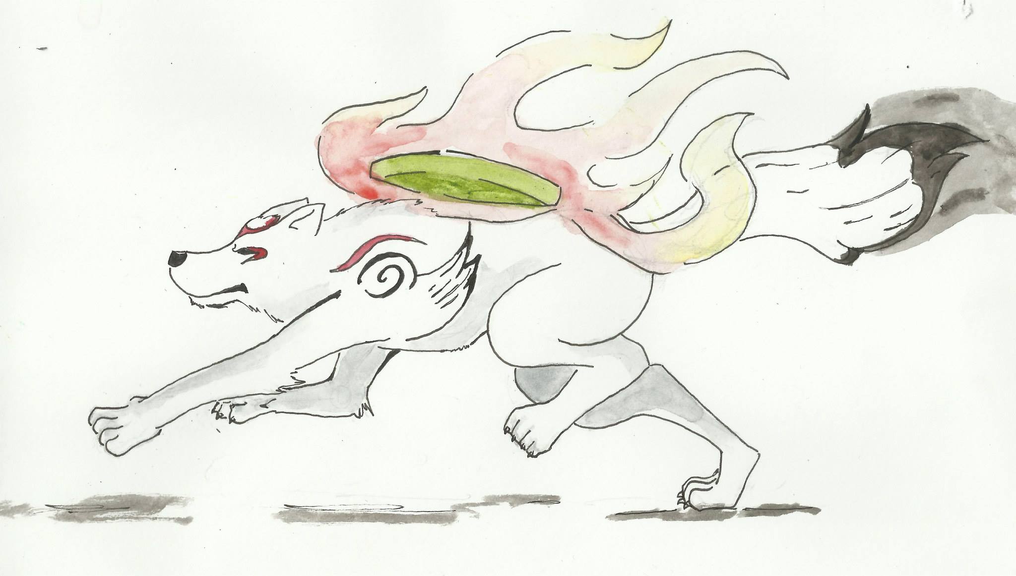 Et pour finit en A5 un dessin d'amaterasu fait à l'aquarelle ( ce n'est pas du papier aquarelle j'ai pris ce que j'avais sous la main à ce moment ^^' )