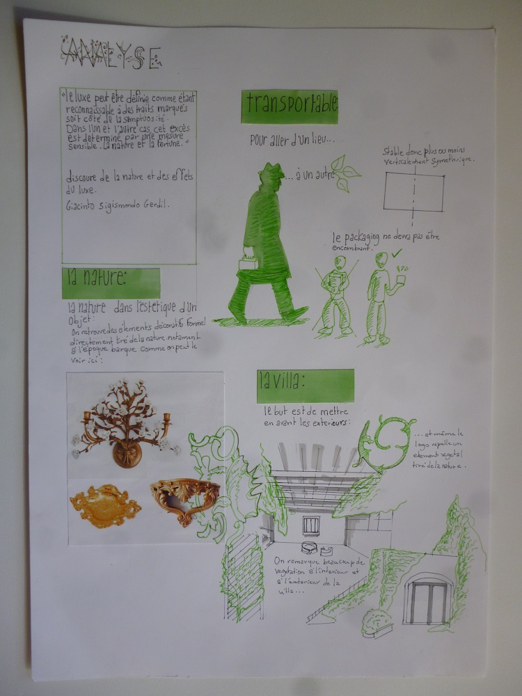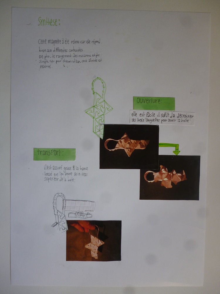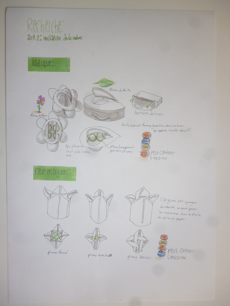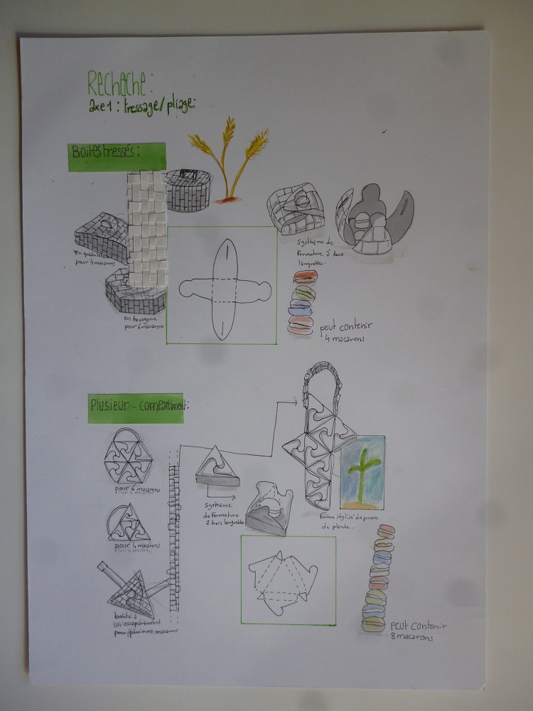 vah, un hotel de luxe du vieux lyon nous à demandé de concevoir une boite de macaron, la première planche est une planche tendance, en gros tu fou tout ce qui t'interesse comme image que tu trouve sur un journal ou sur internet. La seconde est un senario d'usage, pourquoi, pour qui, dans quelle circonstance. Ensute c'est la planche d'analyse, tu analyses le lieu et si tu as un partit prit l'expliquer (enfin c'est ce que j'ai fait) . Ensuite on a les planches recherchent de boite, on met tout ce qui nous passe par là tête en suivant deux axes ou plus. Perso j'ai choisis le pliage et le tressage en axe 1 et pour le second la nature au niveau formel . Et du coup la dernière planche c'est le choix, pourquoi elle et pas d'autres? Là je suis entrain de faire le developpement pour modifier certains trucs , faire des geometraux et des perspectives et ensuite je ferais la maquette final echel reel, comme si elle était en vente .