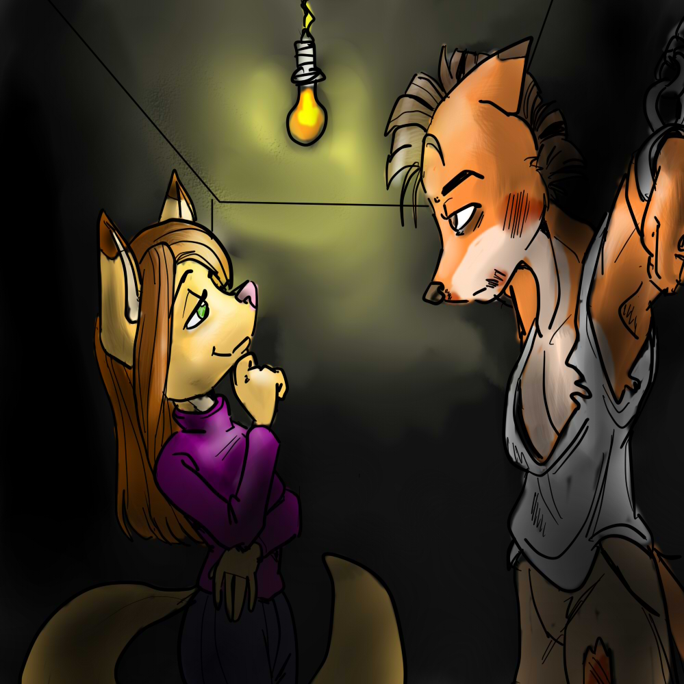 Les détails, bien que tu utilises un style "toony" - plus ou moins - sont plus visibles qu'avant et les personnages arborent des expressions différentes que ce que tu utilisais avant. Il y a quelque chose de plus sérieux qui nous touche plus.J'aurais juste une critique vis-à-vis de la furry qui pend dans le vide : de la tête jusqu'au bassin tu as très bien su donner cet effet "vu de haut" par le raccourcissement du corps et le passage de certaines formes par-dessus d'autres. Mais ce n'est pas le cas pour les jambes dont les tibias sont trop long. De plus, si tu observes bien le corps humain de base, les genoux ont tendance - lorsque le corps ne se tiens pas correctement debout - à passer au-dessus des tibias. Tout comme tes seins passent au-dessus du ventre. Ce qu'on ne ressent pas ici. De même pour les pieds au niveau des chevilles.