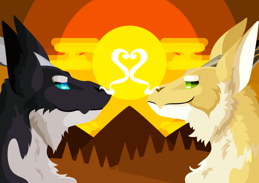 Un joli dessin fait par Miago montrant nos deux dragons lors d'un coucher de soleil avec un petit coeur en prime ^//^A bientôt pour de nouvelles escapades !