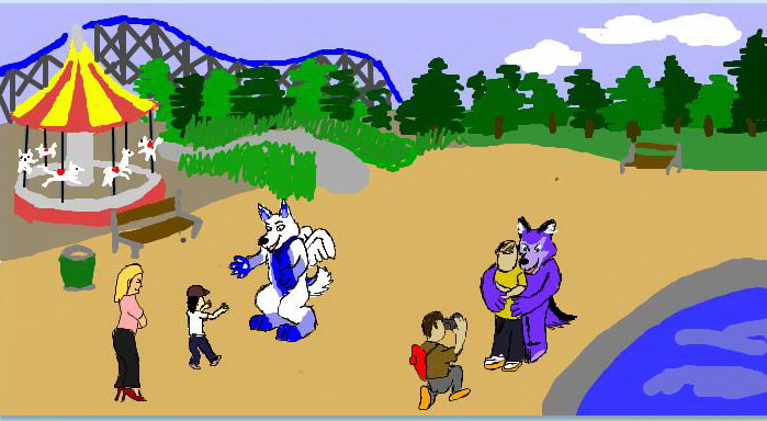 le tagueur et tout en bas à droite : Brek Wolf - Le serrurier qui tente de débloquer la traditionnelle porte condamnée du jour de la rentrée + la prof à sa droite : JBF1 - Le petit loup à cheveux violets : Wylf - Mon fursona jouant le prof à gauche, le lapin et le décor : moi