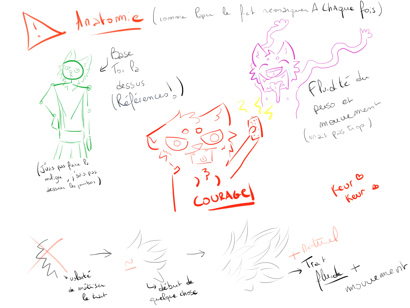 Franchement j'aime bien ton style de dessins mais, comme moi au début, les poils sont hyper raides, essaye de les faire avec une main souple, quitte a t'entrainer a faire de jolis traits droits et courbés sur une vieille feuilleet apres oui, les proportions du corps, ça s'améliore mais c'est pas encore ça... regarde sur les references vraiment, c'est hyper utile :p