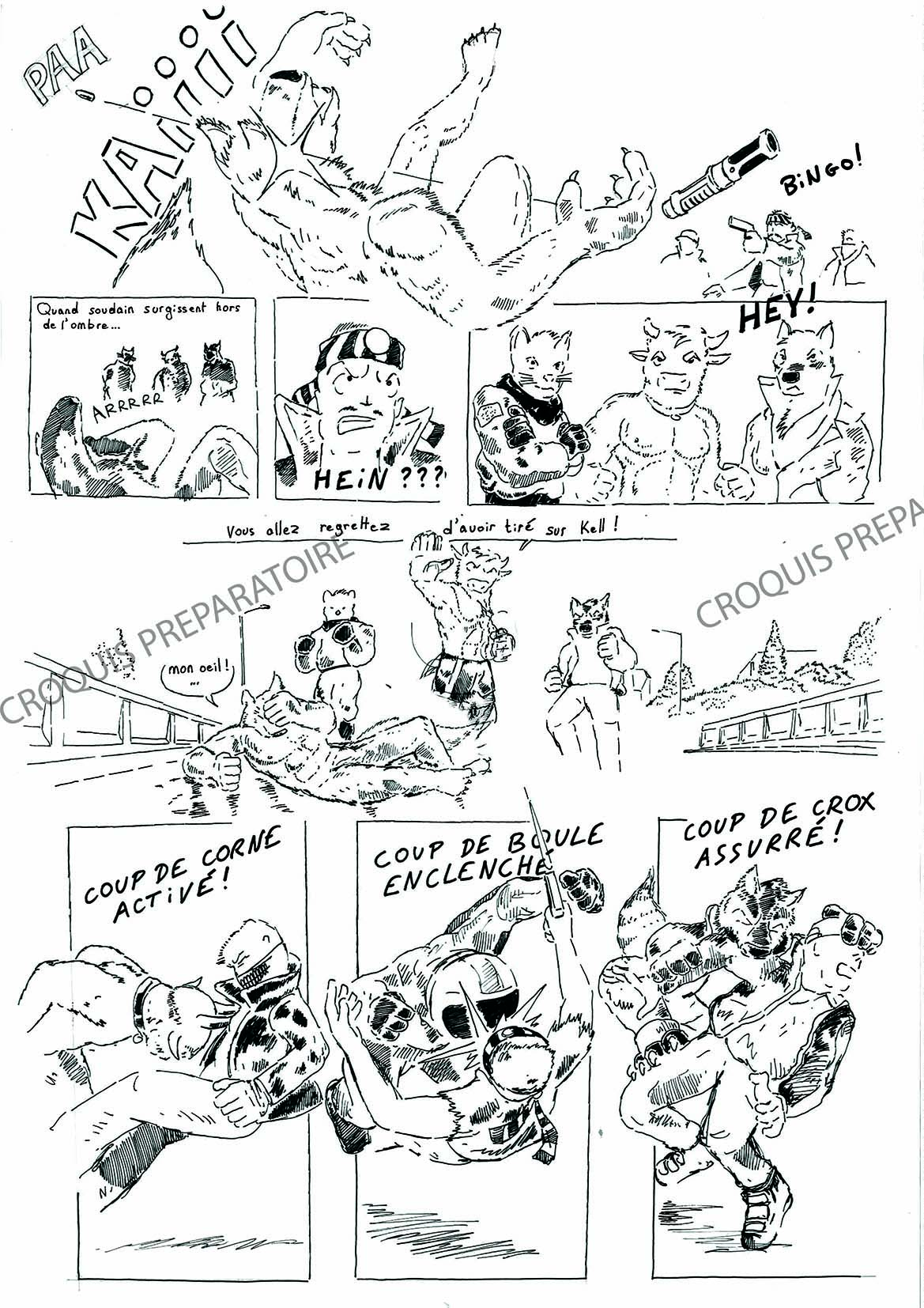 Beaucoup de choses sont à reprendre. Les planches que je vous présente sont seulement là pour donner un premier aperçu. Pour les rehauts de gris, je pense prendre des feutres, au lieu de donner des coups de traits, ce qui rendrait l'atmosphère plus aérée. Pour la deuxième planche je souhaiterais changer la figure du personnage, (au lieu d'attaquer Kell avec une corne, il se munirait d'une machette, ce serait plus cohérent. Il faudra aussi que je redessine de nombreux personnages.