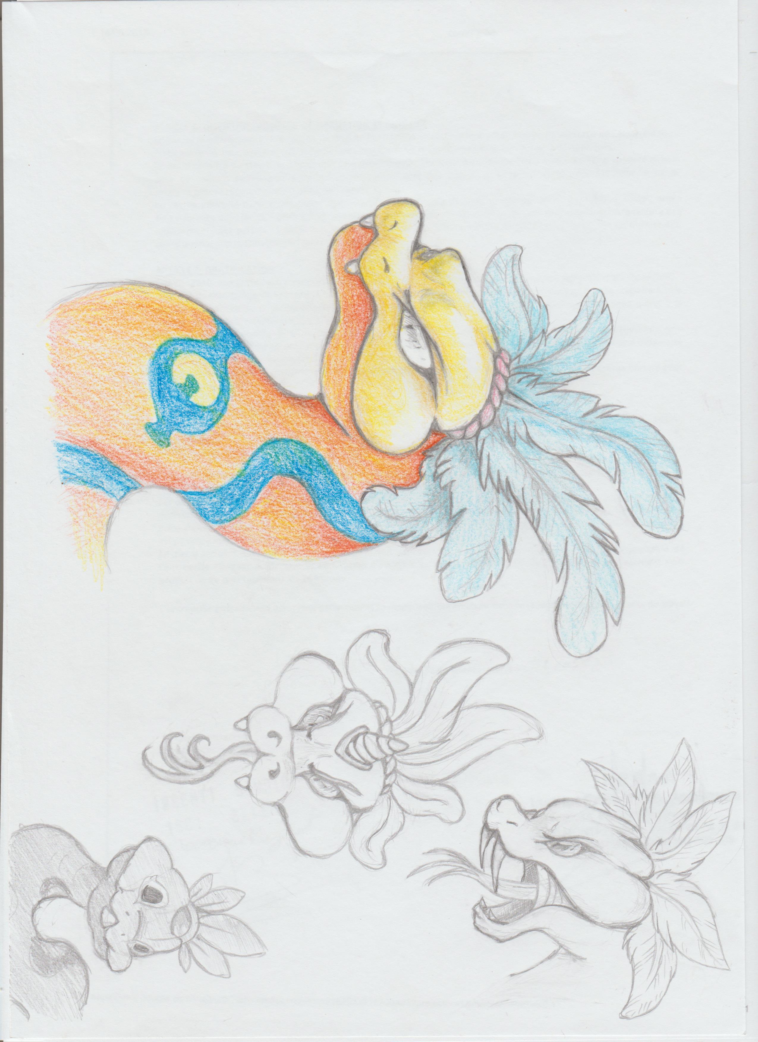 ah ça c'est une longue histoire xD J'ai aussi quelque dessins de quetzalcoatl mais le serpent orange est censé être une représentation d'une autre divinité, Cihuacoatl ( normalement la femme au serpent mais ont va dire que je me suis laissé l'interpretation assez libre vu que dessiner des creatures c'est plus fun ) C'est une divinité liée au maïs et à la terre ^^ Du coup la queue et la corne en forme de foreuse sont là pour creuser dans le sol ou briser des murs par exemple. Comme modèle de base le serpent est censé être un boa arc-en-ciel ( d'où les couleurs orange et bleues :3 )