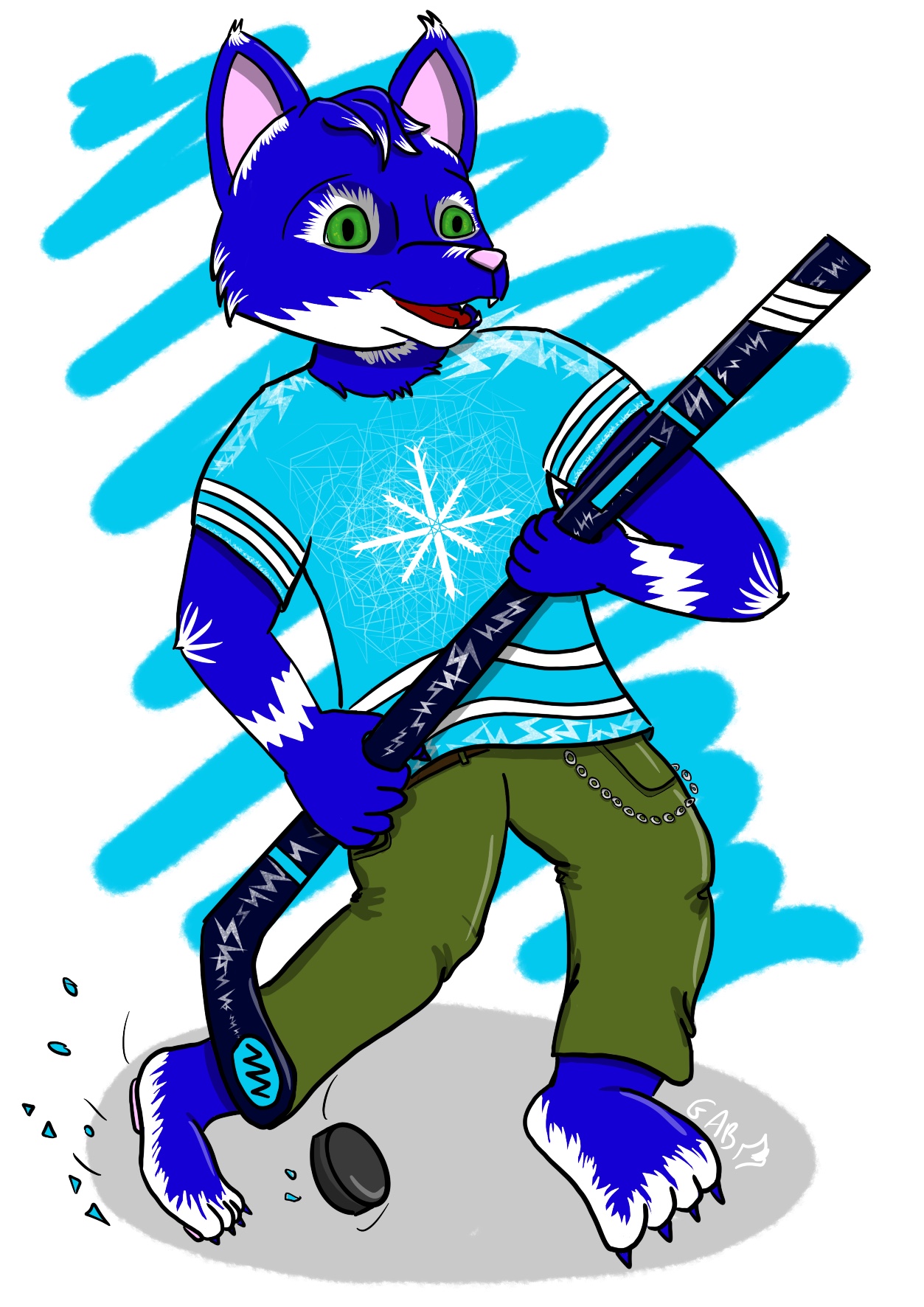 J’aime bien les loups. Et j’aime bien le bleu aussi. Et le hockey sur glace c’est sympa à regarder comme sport. Donc voilà un loup bleu qui joue au hockey  : + [spoiler]