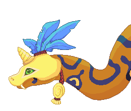 J'ai aussi quelque dessins de quetzalcoatl mais le serpent orange est censé être une représentation d'une autre divinité, Cihuacoatl ( normalement la femme au serpent mais ont va dire que je me suis laissé l'interpretation assez libre vu que dessiner des creatures c'est plus fun ) C'est une divinité liée au maïs et à la terre ^^ Du coup la queue et la corne en forme de foreuse sont là pour creuser dans le sol ou briser des murs par exemple. Comme modèle de base le serpent est censé être un boa arc-en-ciel ( d'où les couleurs orange et bleues :3 )