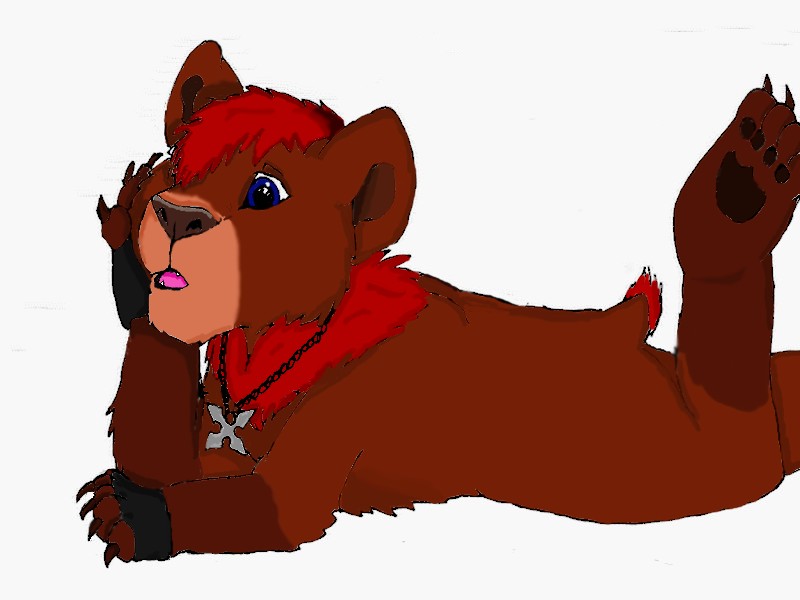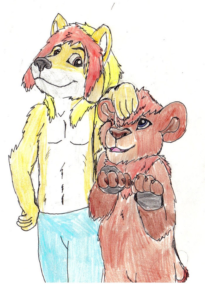 Par contre l'autre on m'a parlé de Furso, un furry qui nous représente vraiment. Et ayant toujours dit que l'ours me représentait, mais que je disais aussi que je préfère les félins, et que je suis plus à l'aise à les dessiner, un petit nounours du forum qui se reconnaîtra m'a conseillé de faire un hybride, Lion+Ours. Donc j'ai tenté la chose, et pour que ce soit mieux car paraît-il que je colorie comme une gamine, j'ai scanné le dessin avec juste les contours noirs et fait la coloration avec Photofiltre. C'est pas super propre car j'ai vraiment pas l'habitude de coloriser mes dessins comme ça, mais j'ai fait de mon mieux et ça m'a mis du temps. Donc voilà, le Lion-Ours, qui me représente bien mieux, son nom est le pseudo que j'utilise toujours d'habitude, Koda. Bon je m'en suis inspiré pour le dessin je le cache pas x) .