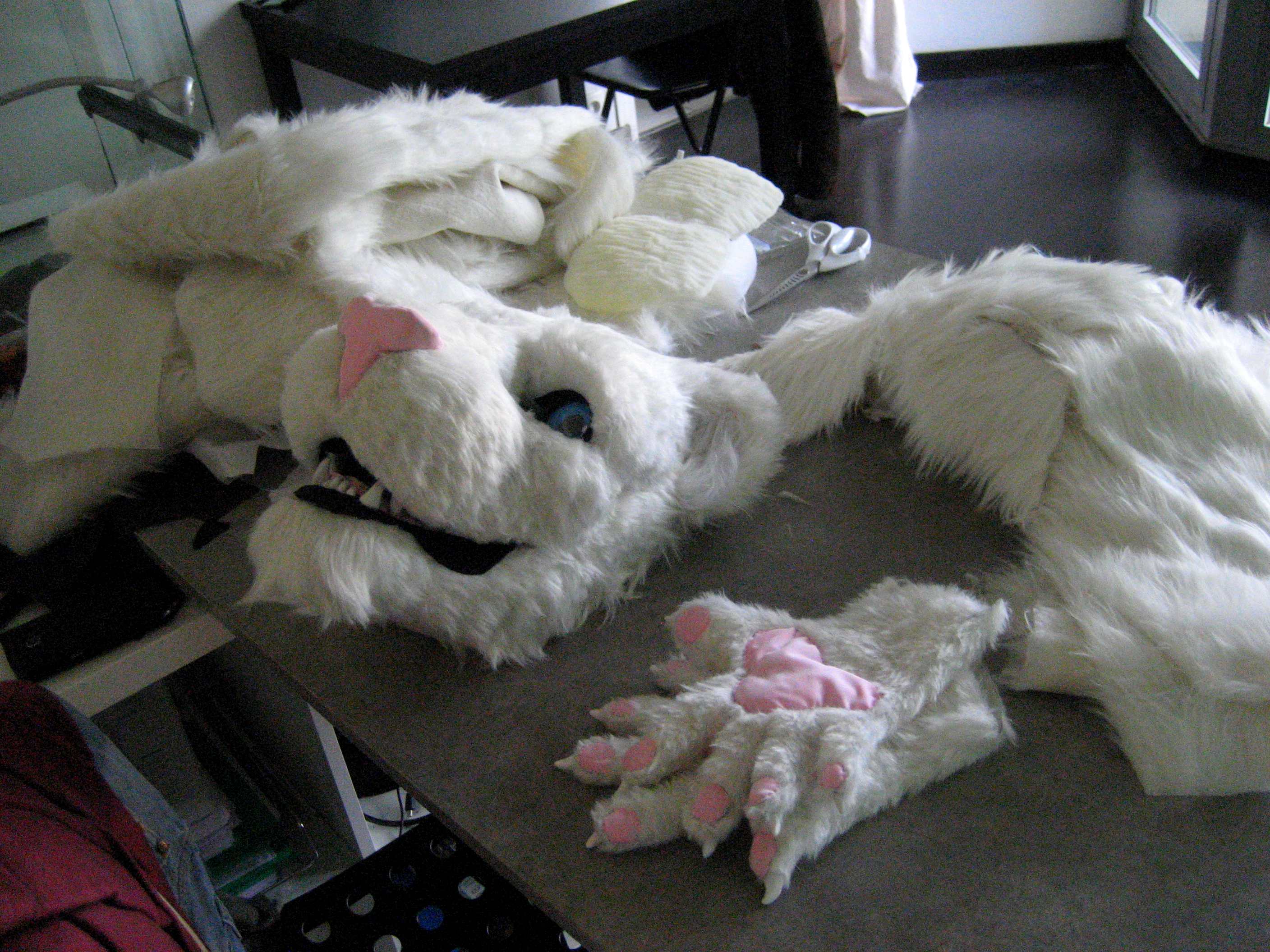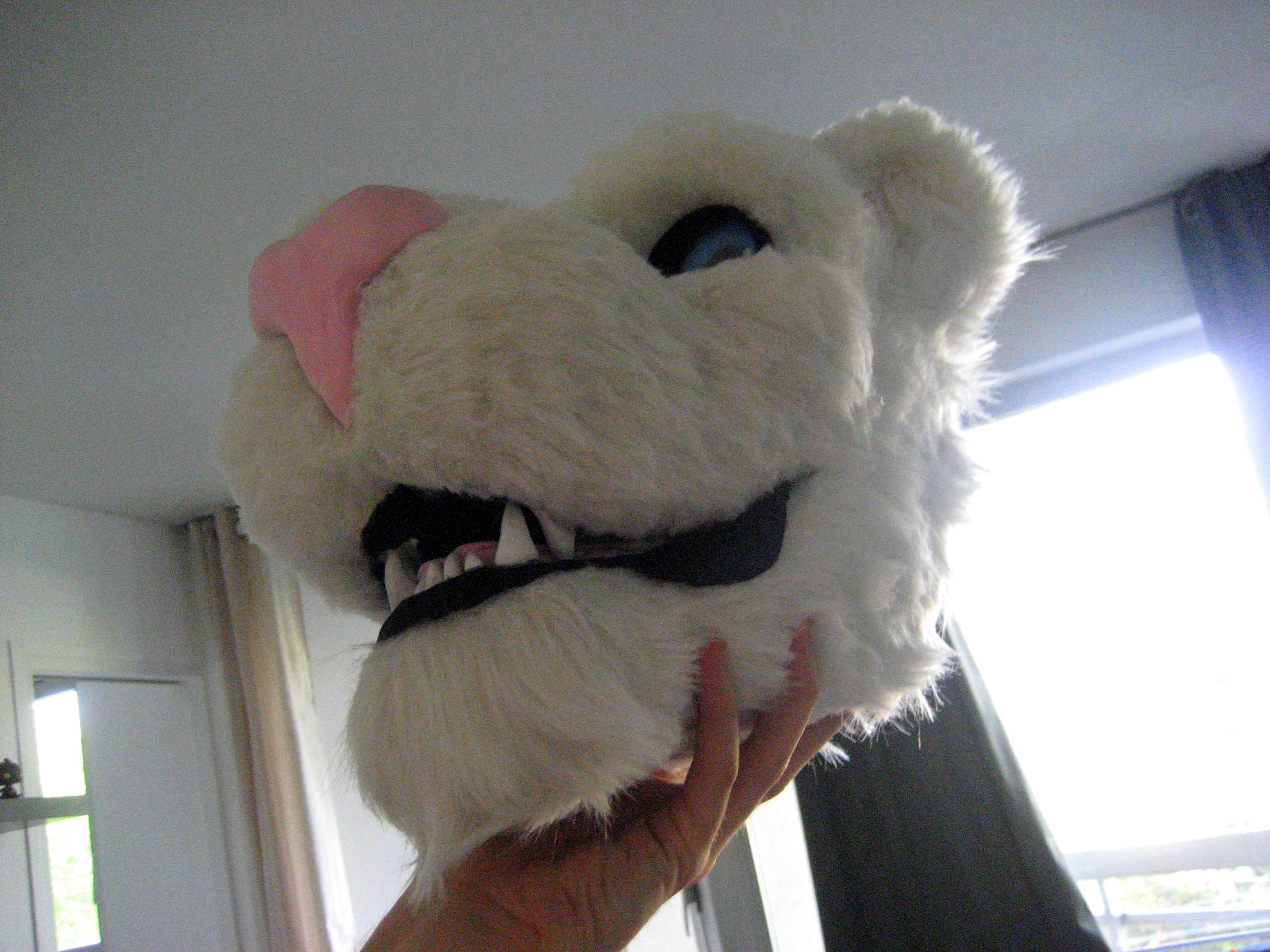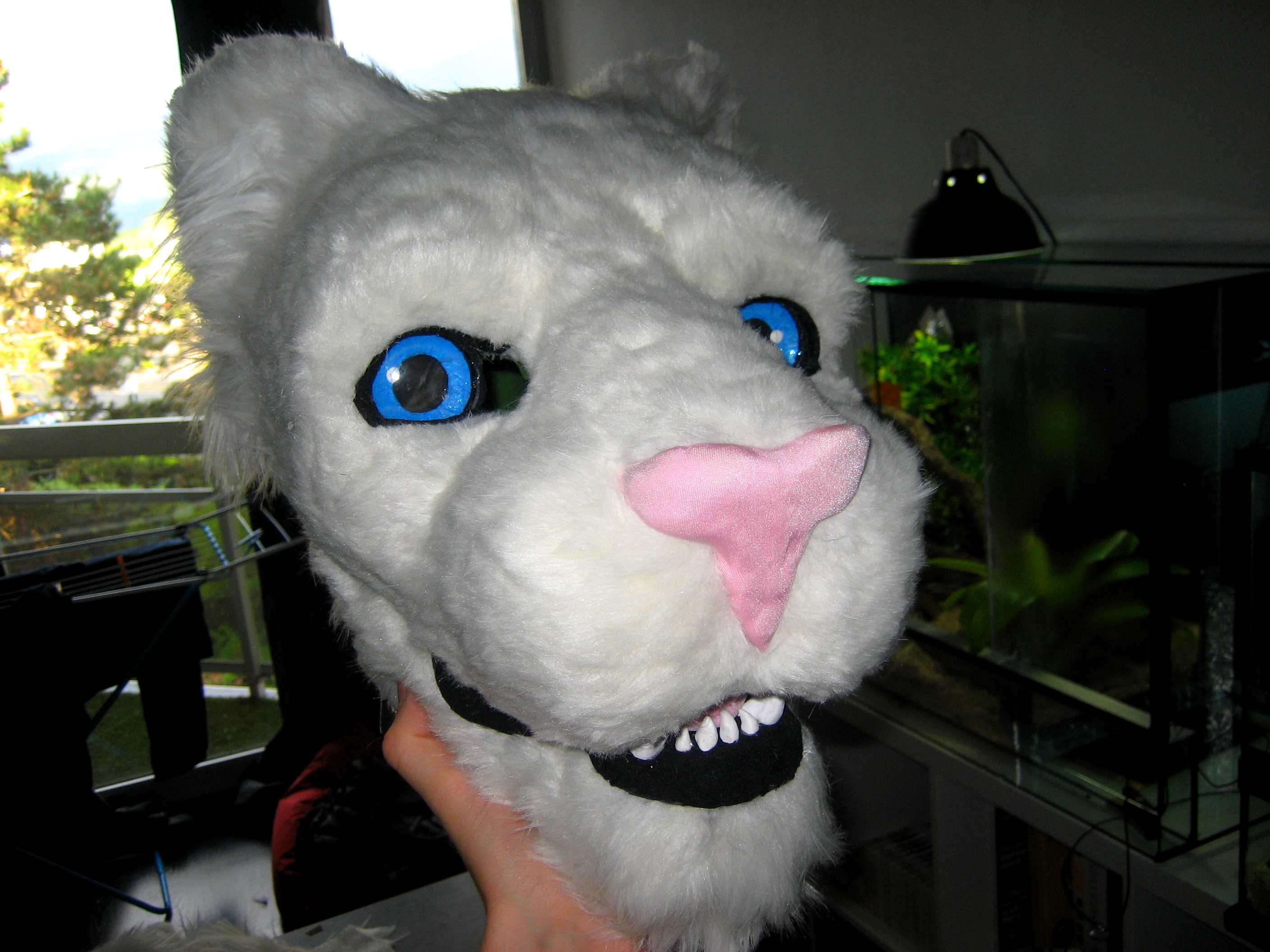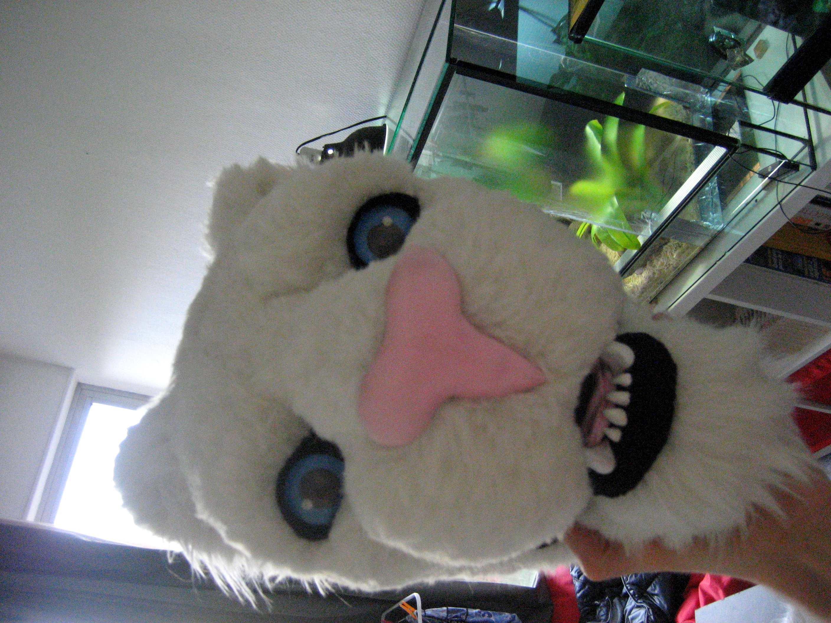 J'ai donc fini de coudre et collé toute la fourrure de la tête, installé le lycra dans la bouche (+ langue) et autour des yeux, installé les griffes, les dents (en fimo peint en blanc acrylique) et fini de coudre/raser les gants. Voilà à quoi sa ressemble :