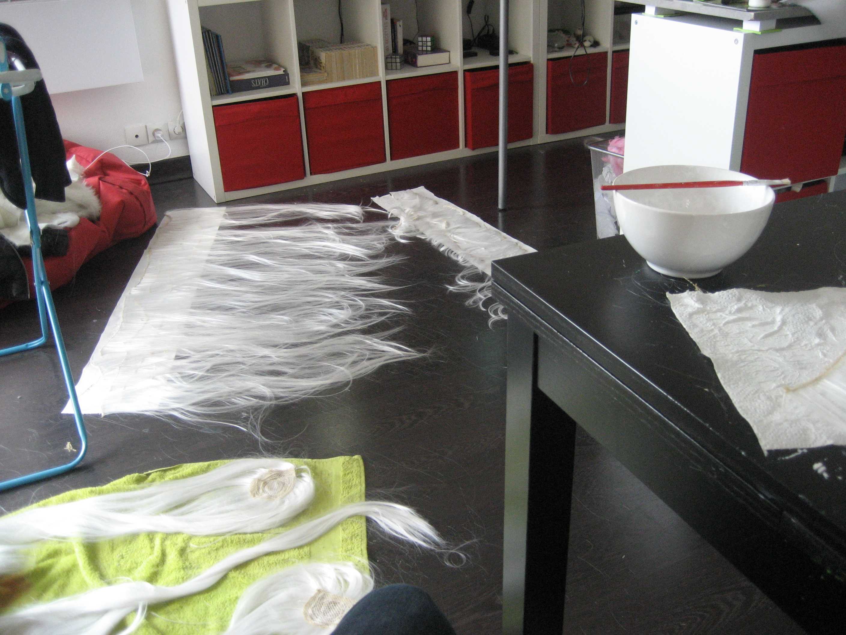 Je suis parti de 3 perruques longues blanches que j'ai découpées afin de garder des 'lamelles' de cheveux de petite et grande tailles