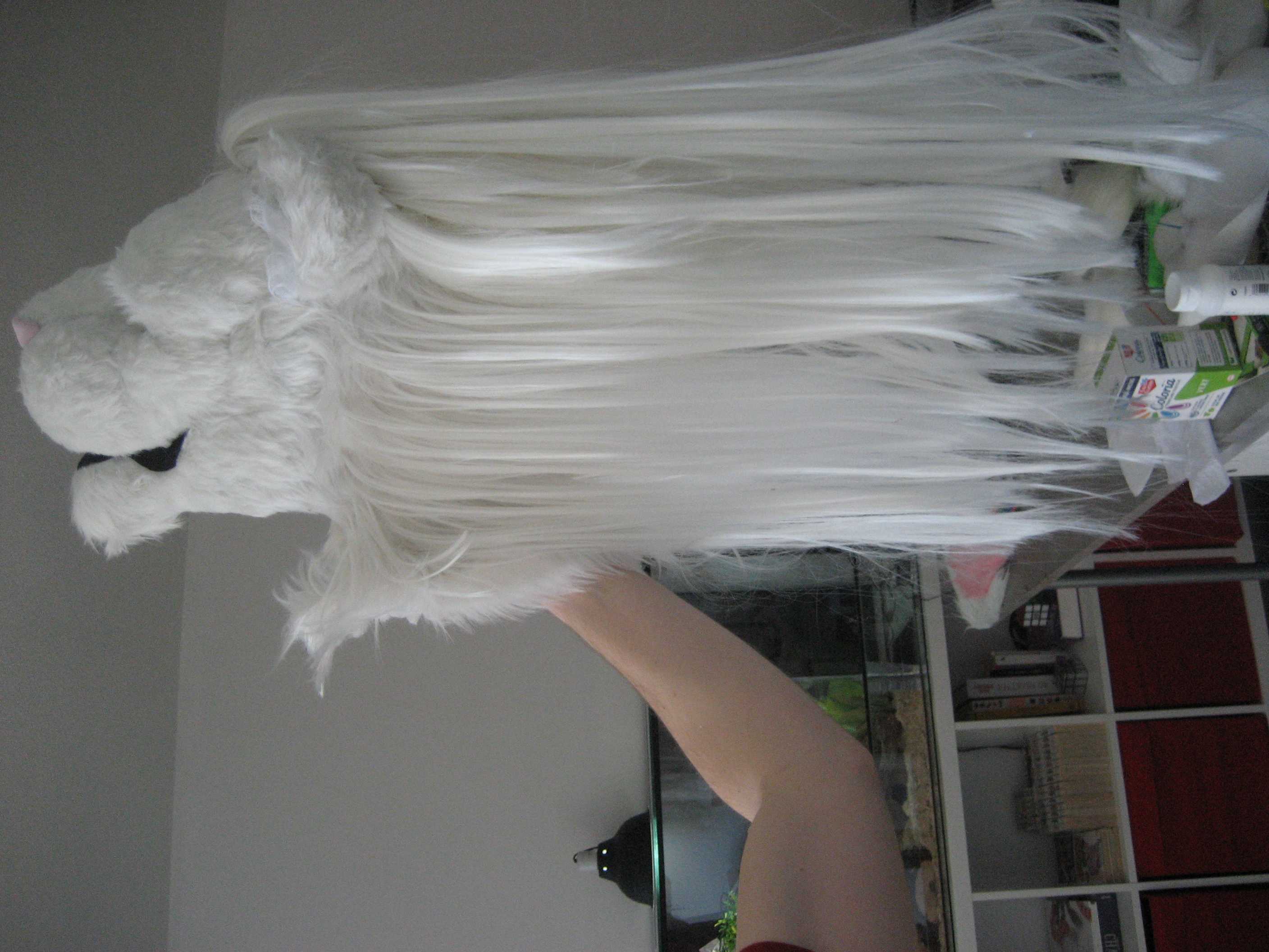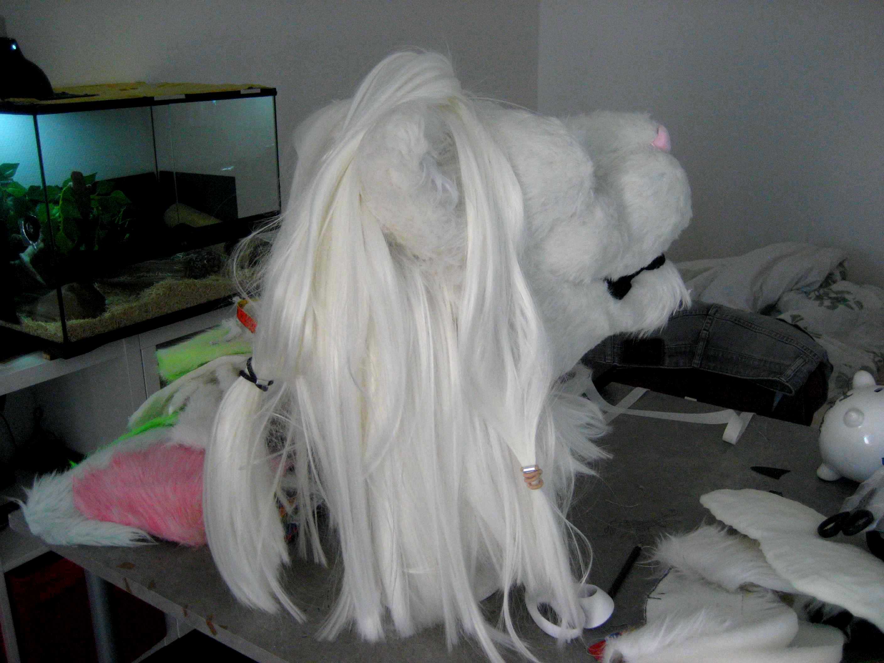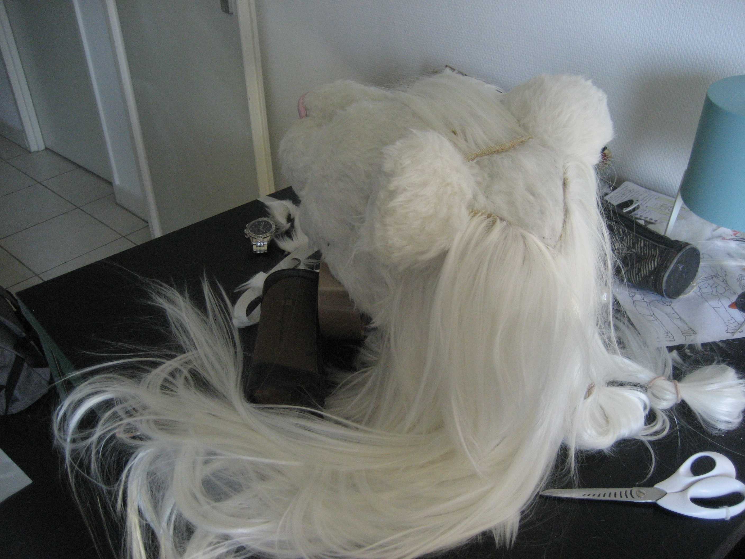 Pour la crinière, j'ai commandé des perruques blanches longues mais elles ont TRES peu de... densité disons et sur un fond jaunâtre. Il y a une ligne de cheveux, puis 2 cm de vide, une ligne, ... Du coup j'avais pensé couper les cheveux et les coller directement sur la tête à la colle chaude. Sa vous semble faisable ?
