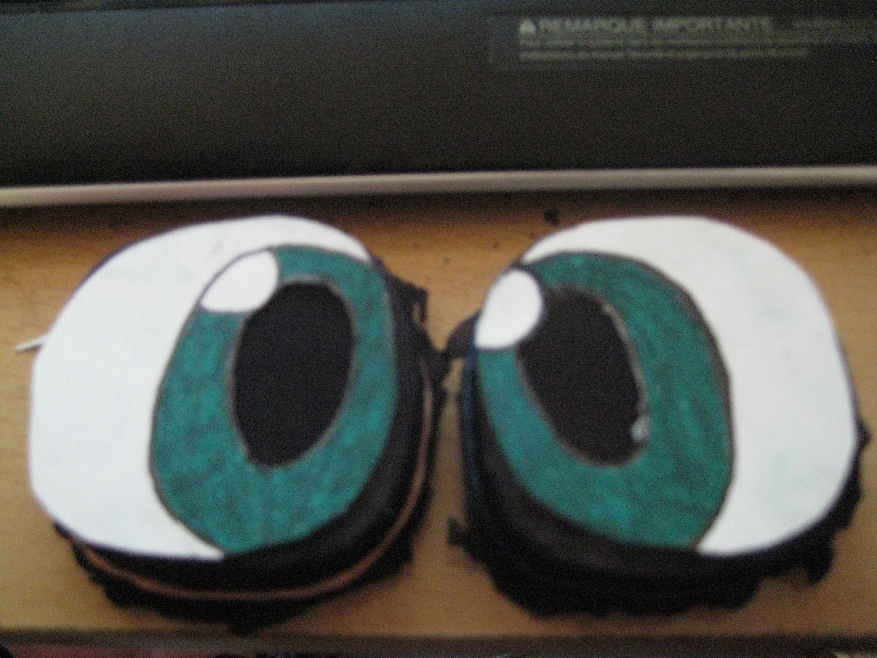 C'est dommage je n'ais pas pris de photos lors de la construction mais je vais essayer de bien expliquer. Pour ma tête j'ai fait avec des yeux type "taxidermie" en plastique comme on en voie sur les peluches de la couleur souhaiter, on en trouve de tout type, taille et couleur sur le net. La vision se fait (comme sur tous avec ces yeux) par un grillage sur le côté des yeux, pour ma part j'ai pris un tissus noir type grillage / "bas-résille" a petit carreaux fins (on en trouve chez les vendeur de tissus type mondial tissus), j'ai fait des triangle avec plusieurs couche pour qu'on ne me voie pas à travers et moi j'y voie trés bien des deux côté en même temps, c'est juste une question de position des yeux par rapport au grillage. Voila pour ma part.