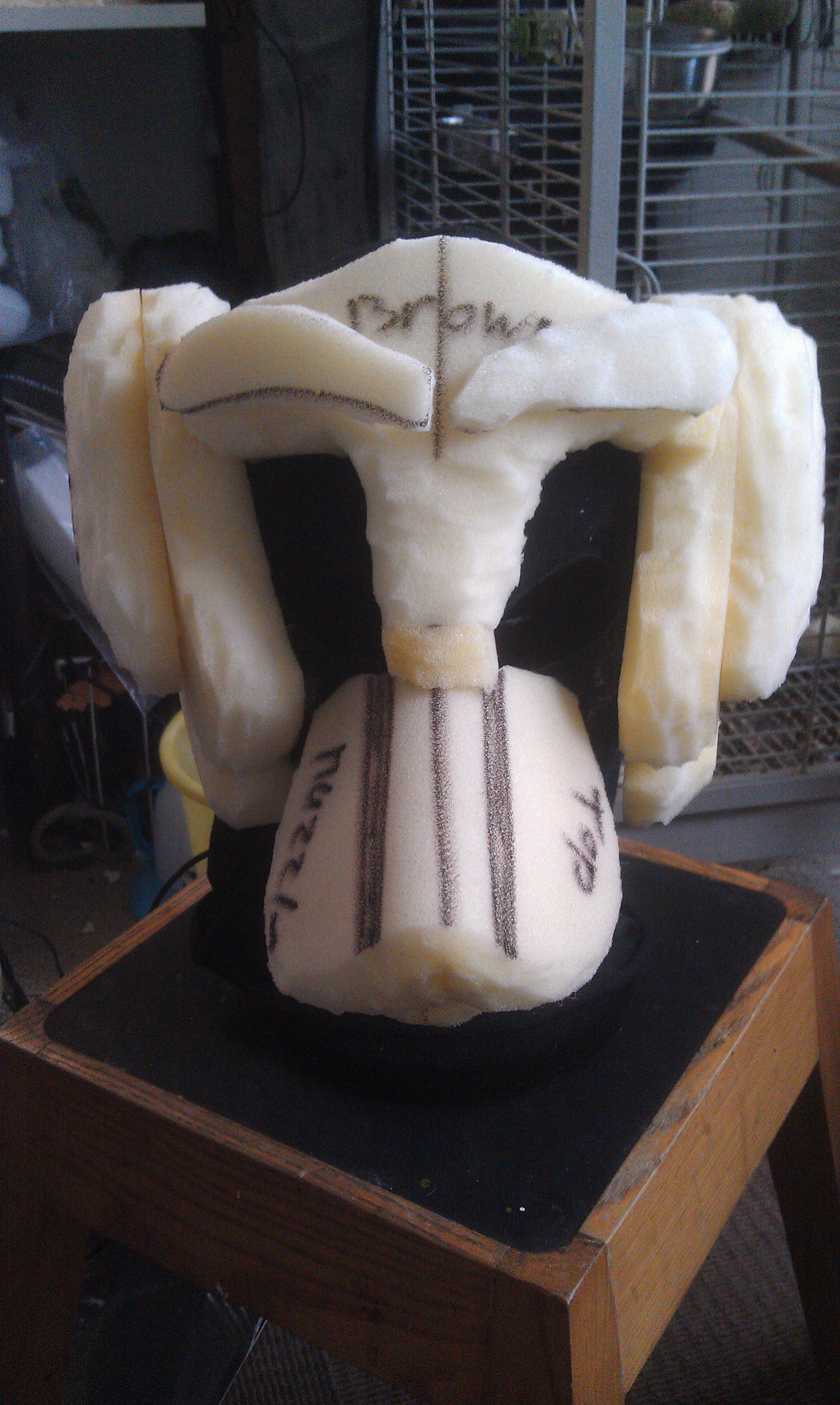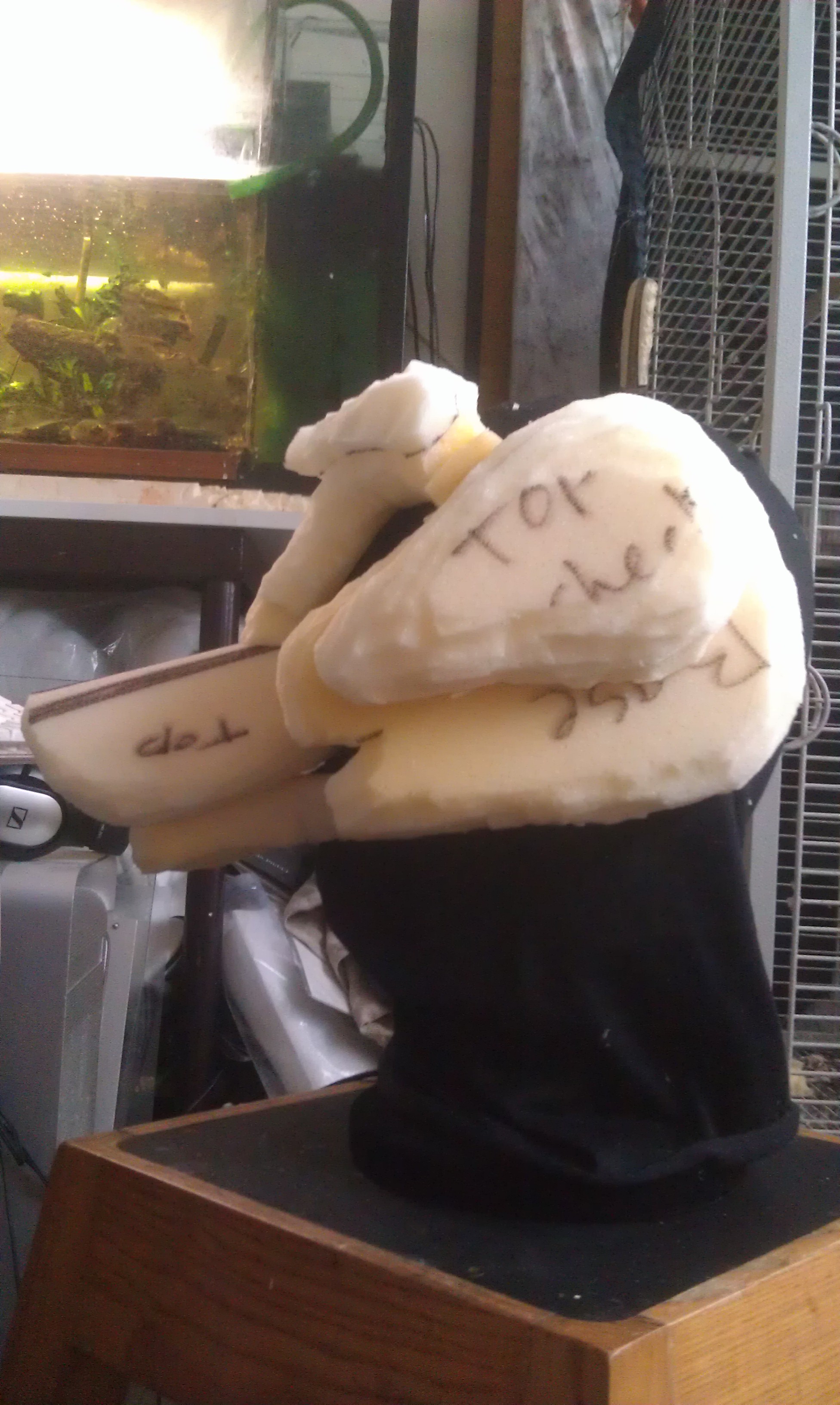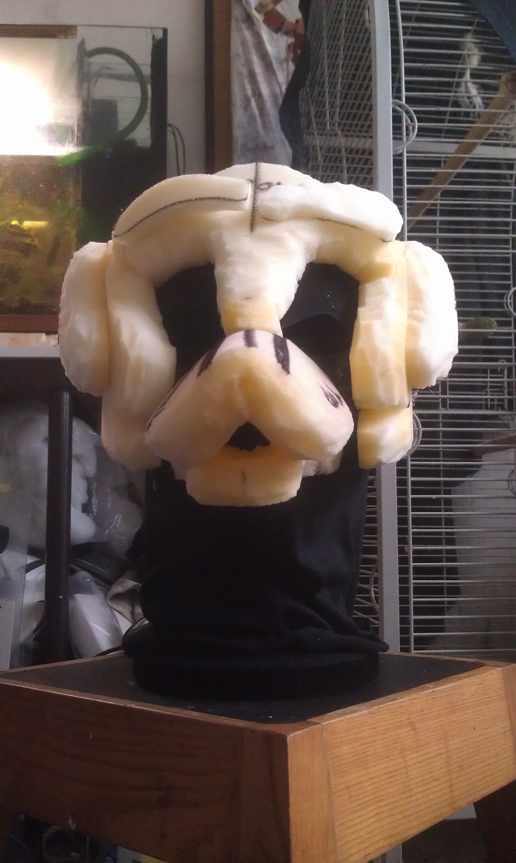 Voila, premier essai de tête en mousse ! Je l'ai commencé sur un coup de tête, par envie ! J'aimerais savoir ce qui ne va pas, ce qui va, les choses à changer, retailler etc avant de continuer avec les oreilles et le duct tape ^^ Merci !