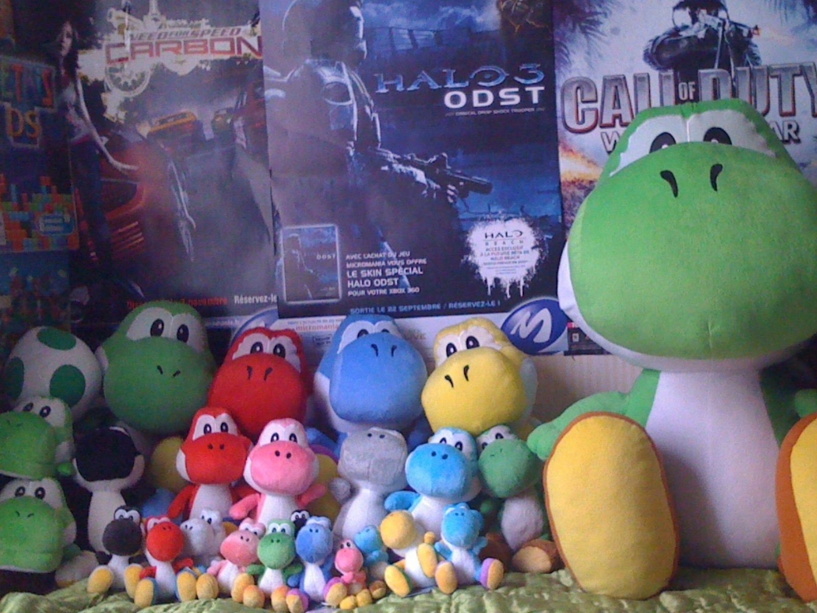 J'en ai un Yoshi, un moyen vert classique, que j'ai longtemps lorgné dans les conv' et magasins. Si un jour je peux, j'me frappe le géant ! :lol: (une piolle qu'avec des peluches géantes en guise de murs ... mouahah le trip)