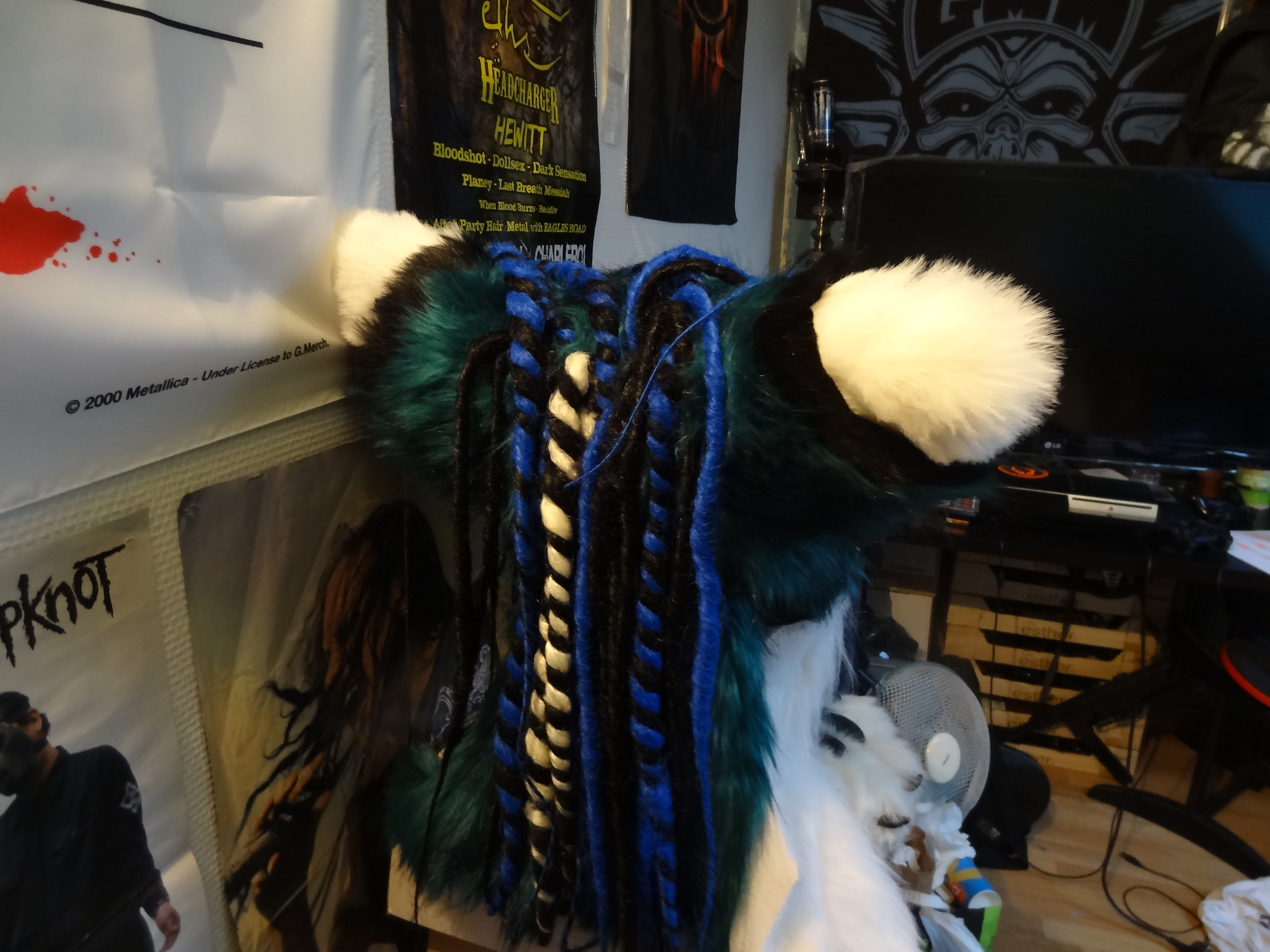 Dans ca cas la, une autre alternative que je viens de tester sur cette tête http://www.furaffinity.net/full/9237013/La j'ai attaché la perruque avec des velcros. Sur le coté résine de la tête, le velcro est collé comme c'était pas possible de le coudre, et du coté de la perruque il est cousu. Par contre sur une tête ou c'est de la fourrure posé/collé sur de la mousse, on peut très bien coudre des deux cotés (de toute façon, utiliser du velcro autocollant sur de la fourrure ca ne tiendrait pas). Ca tient super bien, et sur les suivantes je pense que je ferai la même chose.