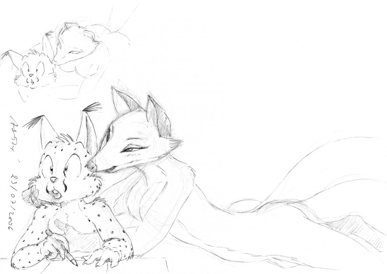 Et donc, avec ce dessin que tu m'as fait et ton aide, j'ai fait une courte petite histoire que je vais poster ici puisqu'en fait d'un compte, c'est une sorte d'art-trade. (et puis vu que tu l'as déjà lue et appréciée, et tout...!). Et puis ça permet d'avoir à tous les deux un semblant de background à nos personnages/fursonas. J'en avais besoin après tout, et c'était une très bonne occasion ici. Je te remercie de m'avoir donné l'envie de le faire, de m'avoir conseillé aussi. Croisons les doigts pour que ça plaise à d'autres! Sinon bah, tant pis.