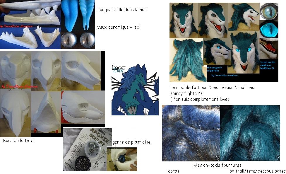 bon et bien je me lance a ouvrir le sujet de la pré conception d'Erin. Je suis novice, ce sera ma toute premiere  j'espere ne pas foirer mon coup (vu le cout) Voici mes 'noob' questions: 1/ J'ai trouvé pas mal de choses chouette sur le site de dreamvision http://www.dreamvisioncreations.com. Quelqu'un as t il déjà commander dessus?? Est ce fiable?? J'ai adoré la couleur qu'elle a donné a son sergal et adorant le bleu je vais essayer de trouver les bonnes fourrures (je suis quelques une sur eBay mais vu les prix  +/-45€ le mètre, j'attend encore un peu  ). Au départ, j'aimais bien noir + bleu puis au final je me suis rabattue sur turquoise jade + bleu. 2/ La question qui me taraude le plus est: pour fixer la fourrure sur la tête, ca se coud puis enfilé ou ca se colle sur la base ou mousse???? 3/ Ou mettre le boitier des leds pour les yeux? Dans le cou? 4/ Pour la visibilité, beaucoup parle de moustiquaire, ca fonctionne bien (les pour et contre) sachant que j'aimerai poser des leds... 5/ Sur un tuto (une fursuiteuse d'un chat jaune assez manga  ) pour les cheveux, ils sont posés comme pour fabriquer une perruque, par bande... Ou en trouver? ca porte un nom spécifique pour commander ca par eBay?? (les cheveux d'Erin étant assez long) Voila déjà une bonne flopée, la tête étant la première chose que j'aimerai faire (le plus compliqué aussi - avec les patounnes pieds). arigatō gozaimasu!!