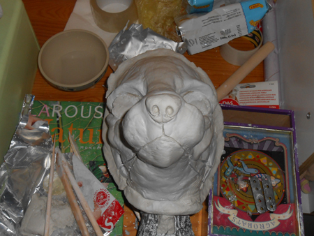 Ensuite, toujours prévoir que la fourrure, même rasée, rajoute un volume conséquent. Tout ce qui en dépasse doit avoir l'air plus grand que nature avant la fourrure. En particulier la truffe et les oreilles. Là, la truffe va vraiment être petite une fois finie ! Dans le même délire, le museau est large, surtout pour un renard... Avec le poils, tu peux bien rajouter 1,5cm d'épaisseur, à ce moment là, il ressemblera à un berger allemand, le pauvre