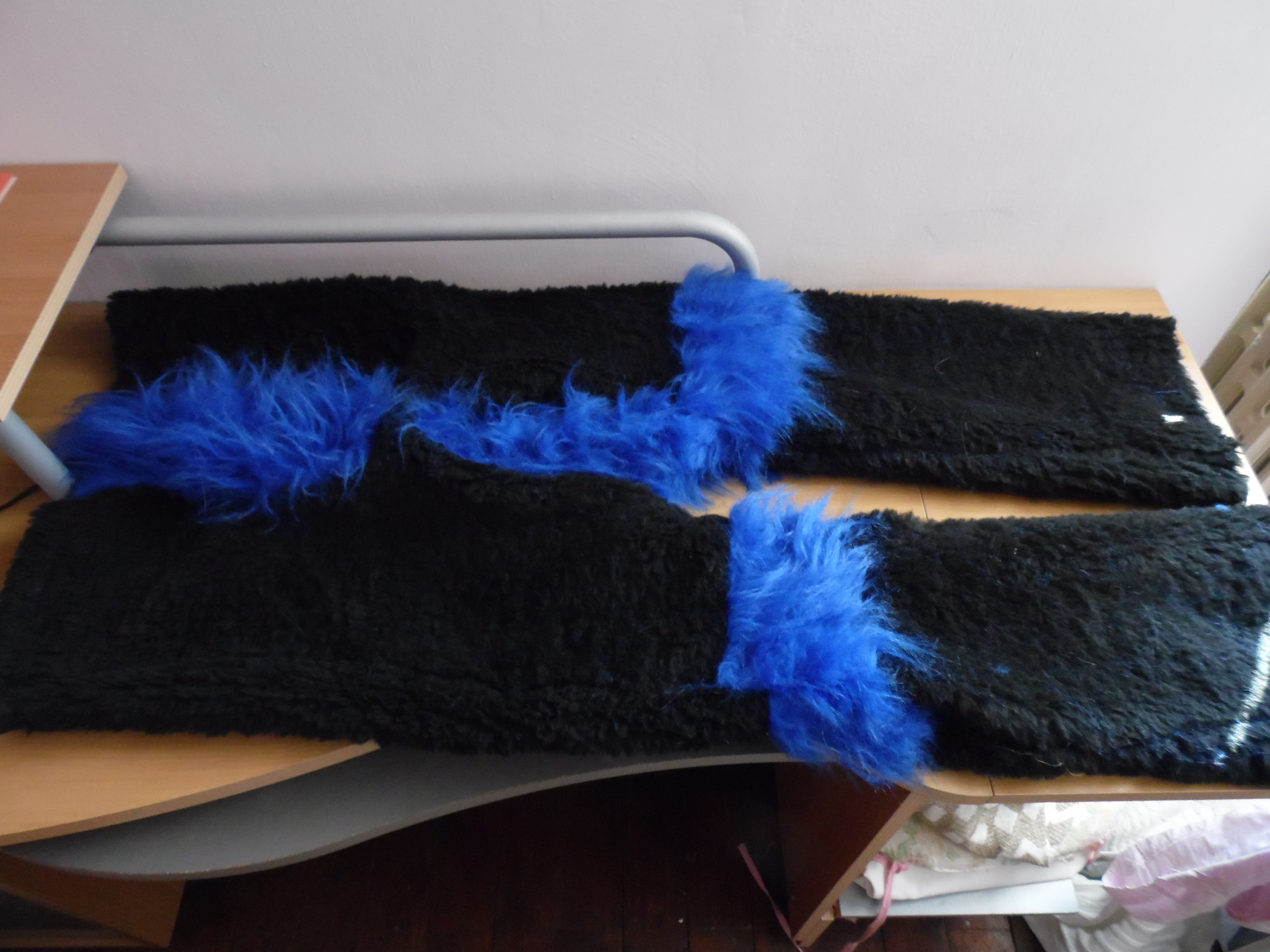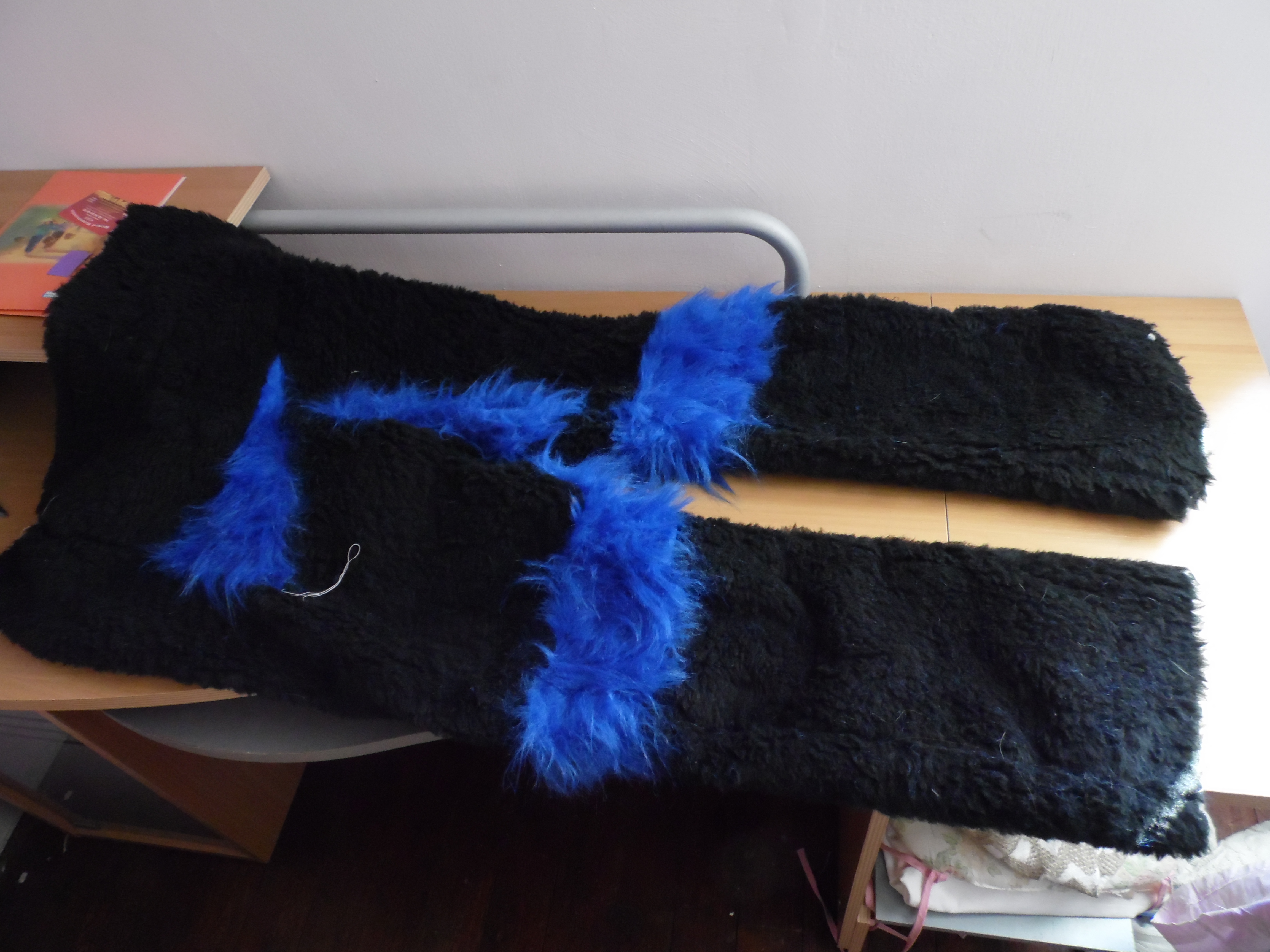 les pattes sont faites mais je ne les aime pas, si il me reste de la fourrure bleue a la fin de les referais, la queue est terminée, le pantalon est fait il n'y a pas de digilegs (snif), le haut du corps et également fait avec les manches et tout et tout.