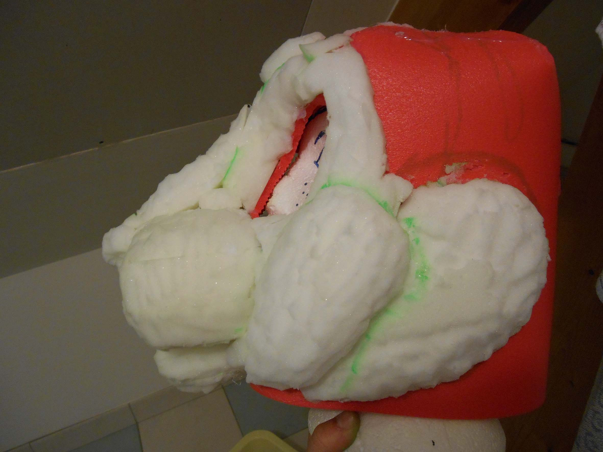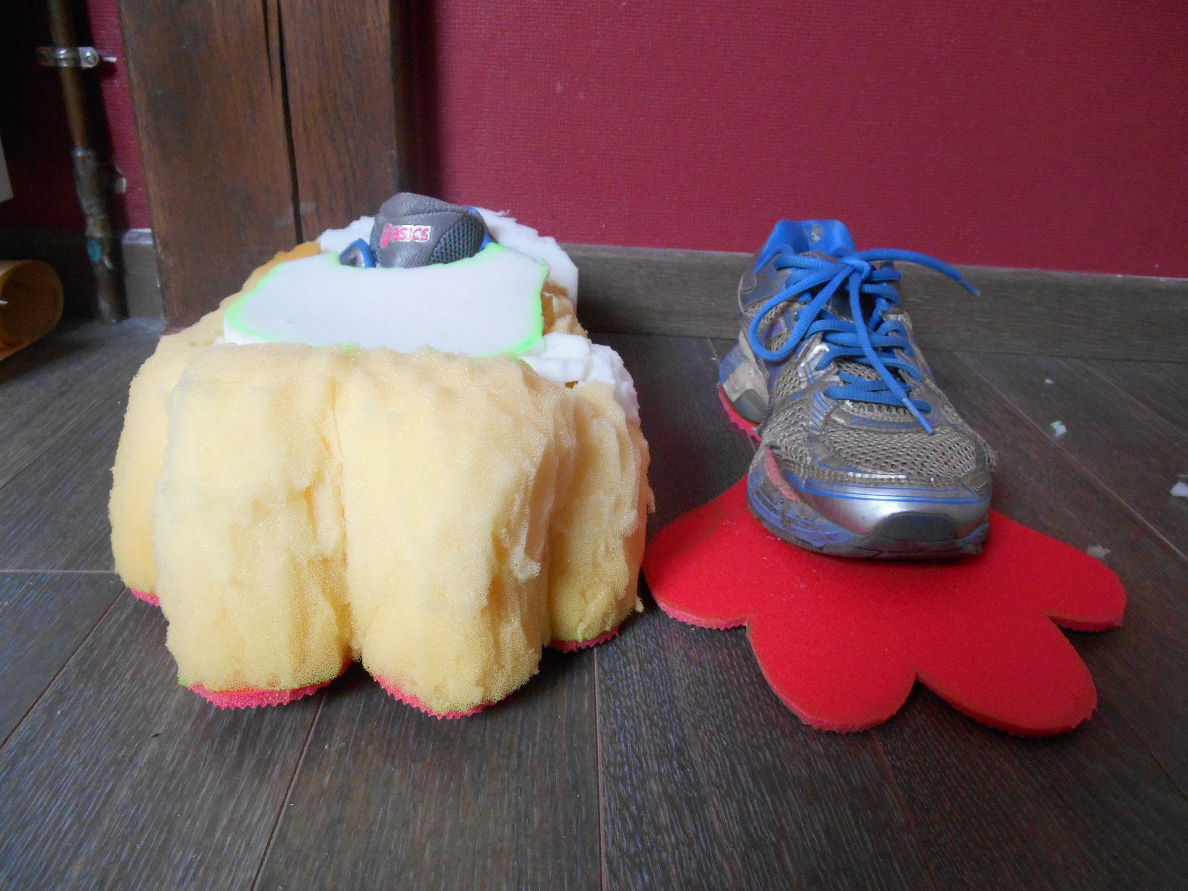 J'ai également commencé les feetpaws avec deux sortes de mousse. Une très alvéolée (la jaune) toute souple qui me permet de plier la patte très facilement. La blanche permet de rigidifier l'arrière avec sa densité plus importante. + [spoiler]