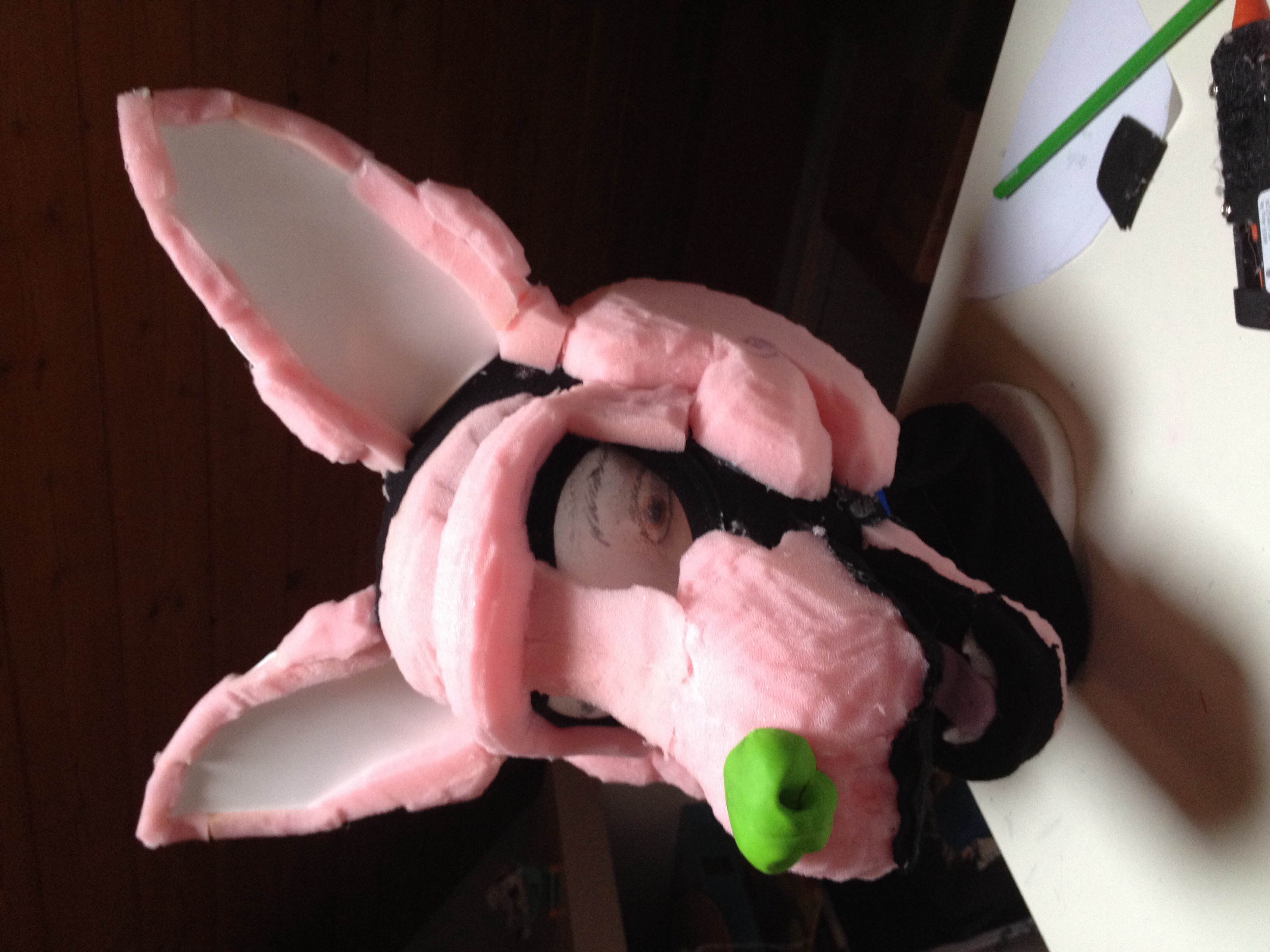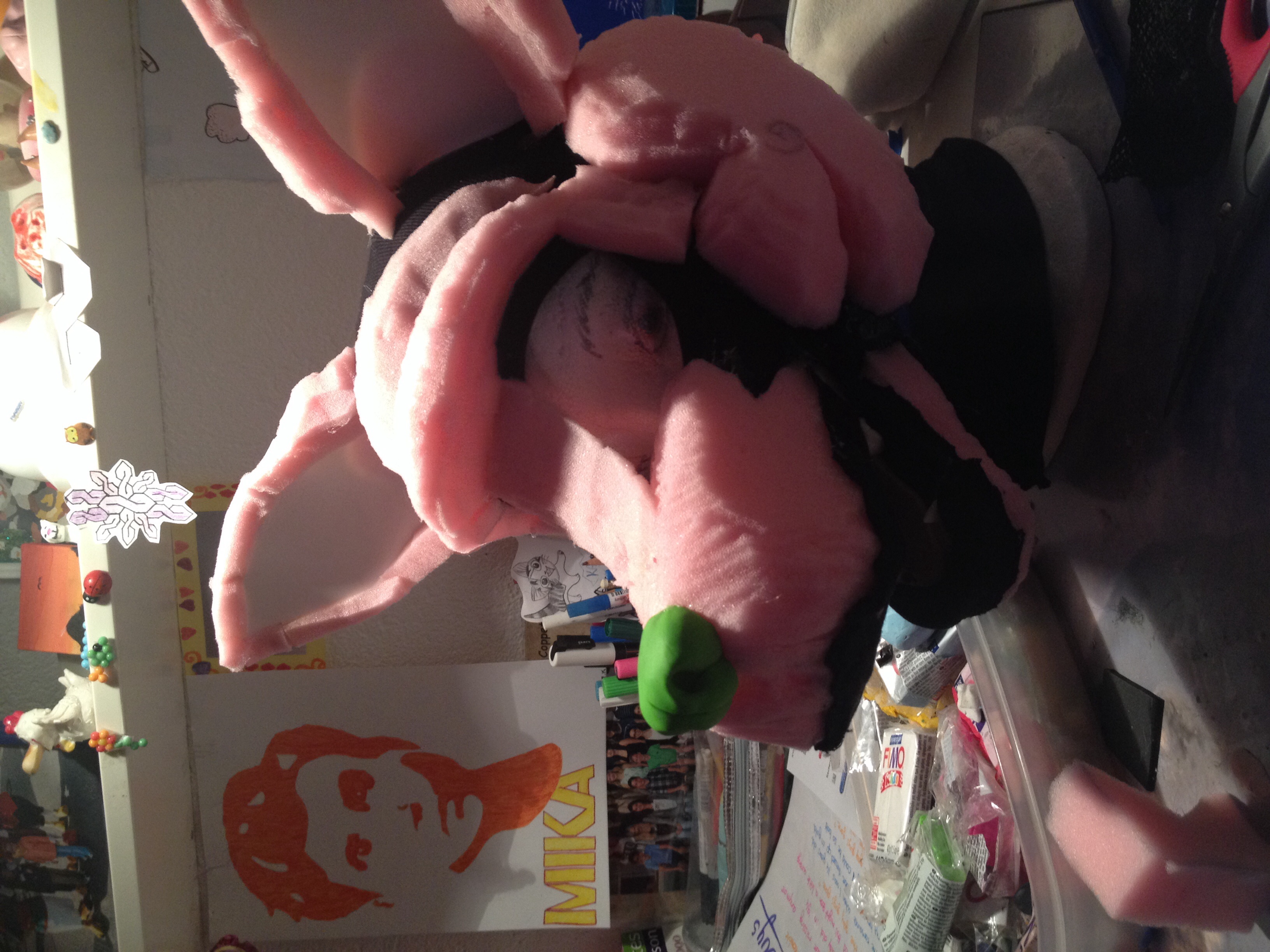 Alors pour les yeux c'est de la mousse toute fine là, créa mousse j'sais pas comment ça s'appelle avec une sorte de tulle (je me demande ? le nom) noire que j'ai mis pour la pupille et je vois très bien avec et les trous ne sont pas trop visible ! Des photos arrive, je suis en train de m'énerver seule à mon bureau en essayer de faire en sorte que ca ne bug pas  Alors voila une photo de la base ne faites pas attention au petit bout entre le museau et la joue il est pas collé ni rien ct un test de qqch :