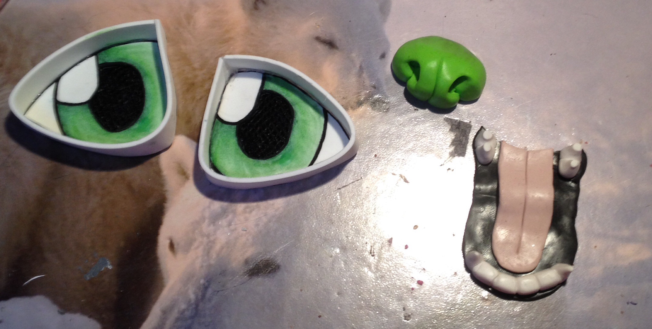 Alors pour les yeux c'est de la mousse toute fine là, créa mousse j'sais pas comment ça s'appelle avec une sorte de tulle (je me demande ? le nom) noire que j'ai mis pour la pupille et je vois très bien avec et les trous ne sont pas trop visible ! Des photos arrive, je suis en train de m'énerver seule à mon bureau en essayer de faire en sorte que ca ne bug pas  Alors voila une photo de la base ne faites pas attention au petit bout entre le museau et la joue il est pas collé ni rien ct un test de qqch :