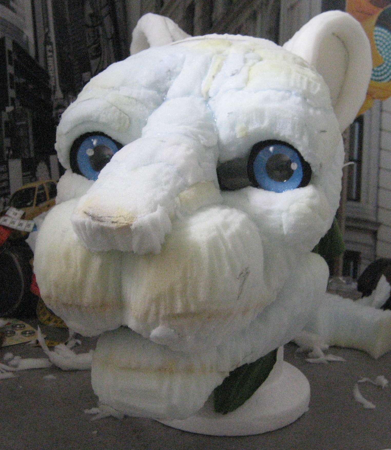 Alors, j'ai fini et collé les sourcils, rajouté de la mousse en arrière, les oreilles et taillé le tout. Sa ressemble à ça maintenant :