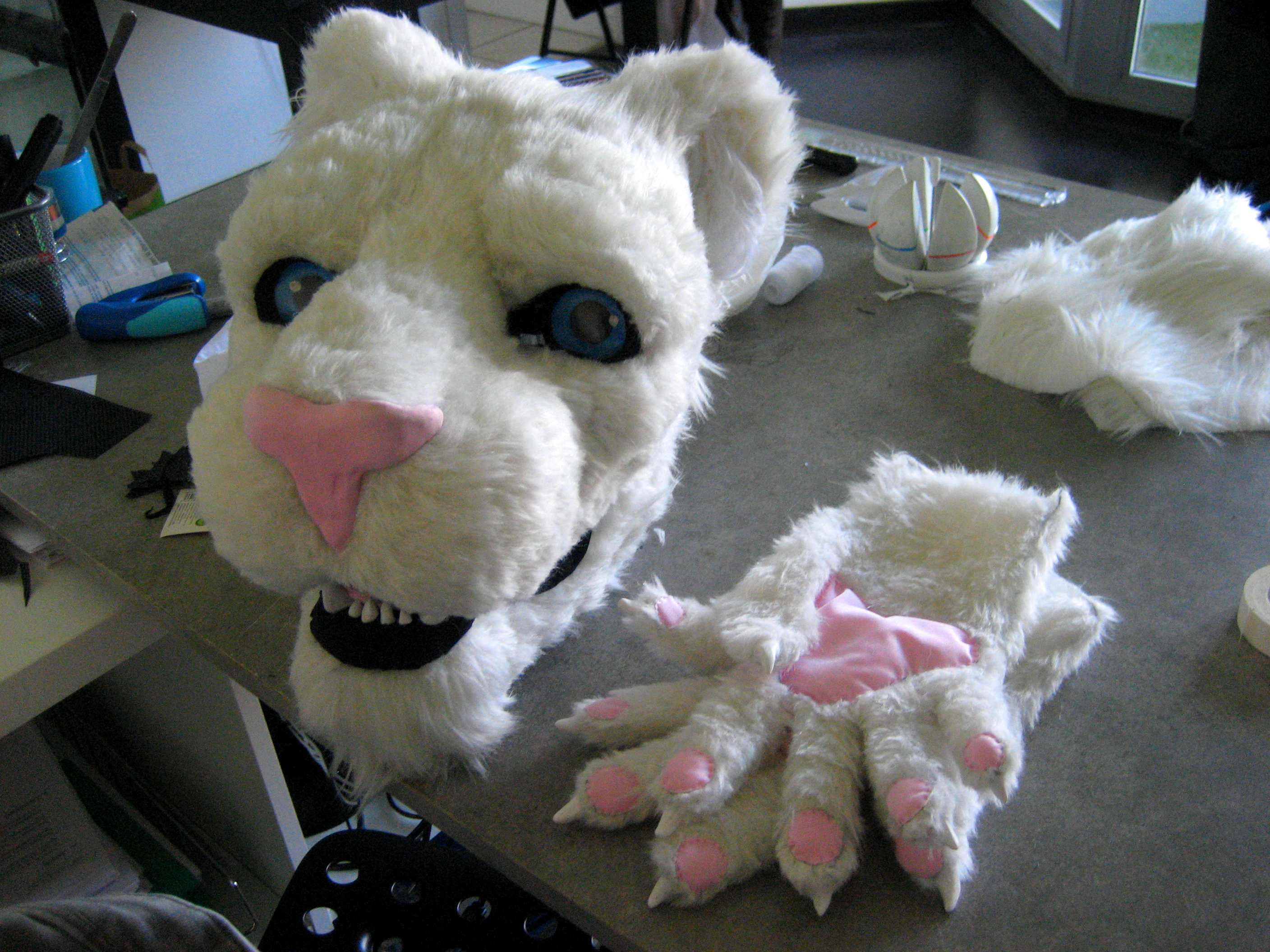 J'ai donc fini de coudre et collé toute la fourrure de la tête, installé le lycra dans la bouche (+ langue) et autour des yeux, installé les griffes, les dents (en fimo peint en blanc acrylique) et fini de coudre/raser les gants. Voilà à quoi sa ressemble :